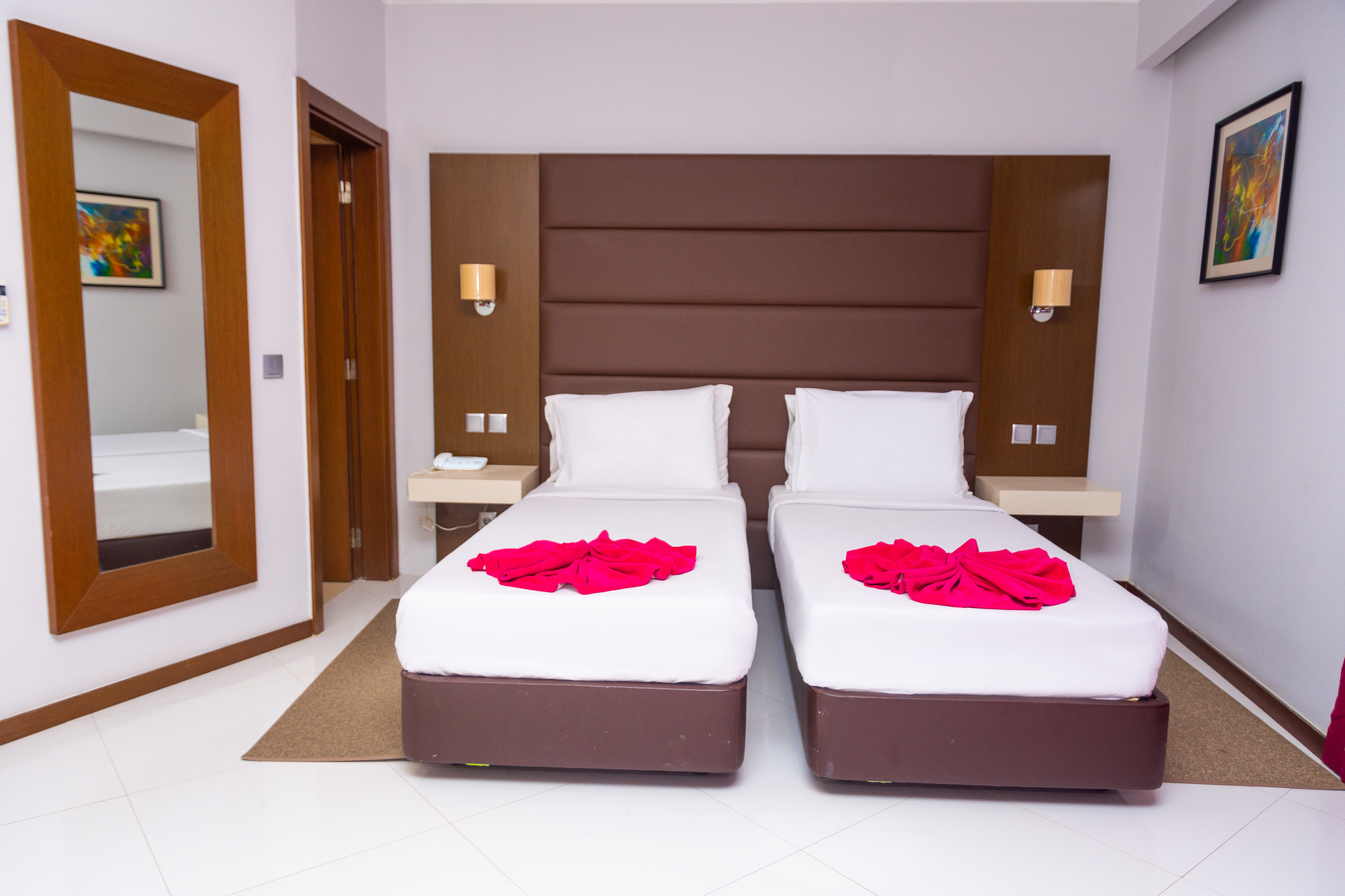 The twin size beds make this to accommodate two individuals. Includes: 1.Breakfast 2.Air conditioned environment 3.Gym 4.Electronic safes 5.Parking 6.IPTV, DSTV 7.Free WiFi 8.Fridge barcafe 9.Hairdryer 10.Private Balcony 11.Phone